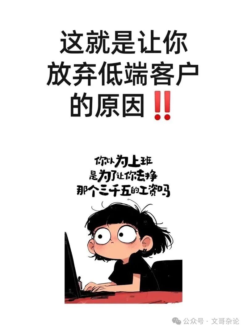 大篇幅讲这个案例的目的是要说,做客户的时候要学会“舍”,这里的“舍”,是敢于放弃消耗你的低端客户。