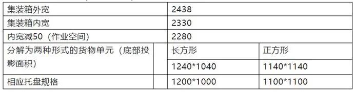 集装箱正方形的集装单元可以两排并列装入集装箱,而长方形的则必须纵横并列可装入集装箱。对应的有两种规格的托盘尺寸:长方形的1200*1000和正方形的1100*1100。