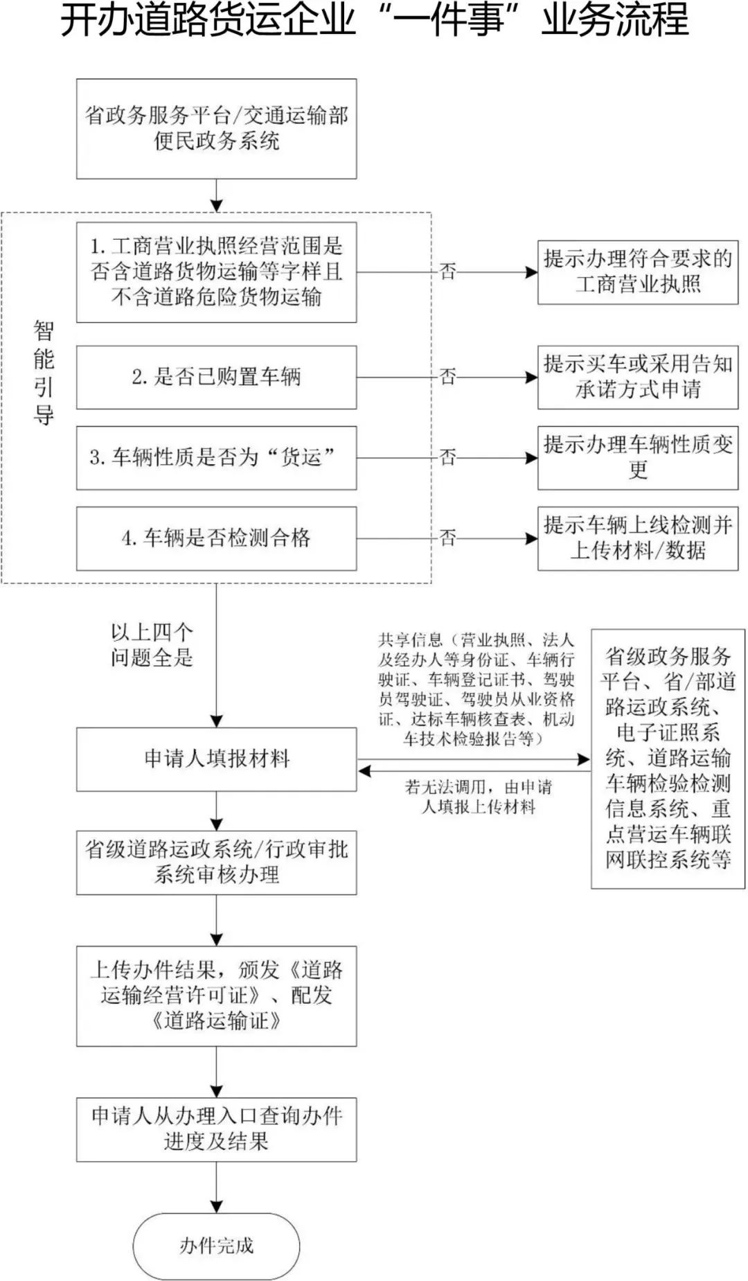 以实现高效开办道路货运企业(含个体工商户)“一件事”为目标,优化开办道路货运企业涉及的政务服务流程,强化业务协同和数据共享,线上开通业务受理模块,实现“全程网办、一网通办”;线下设立工作专窗,实现“一窗受理、限时办结”,形成线上线下一体化的政务服务模式,推动实现开办道路货运企业“一件事”的办事方式多元化、办事流程最优化、办事材料最简化、办事成本最小化,最大限度利企便民,全面提升人民群众的获得感、满意度。
