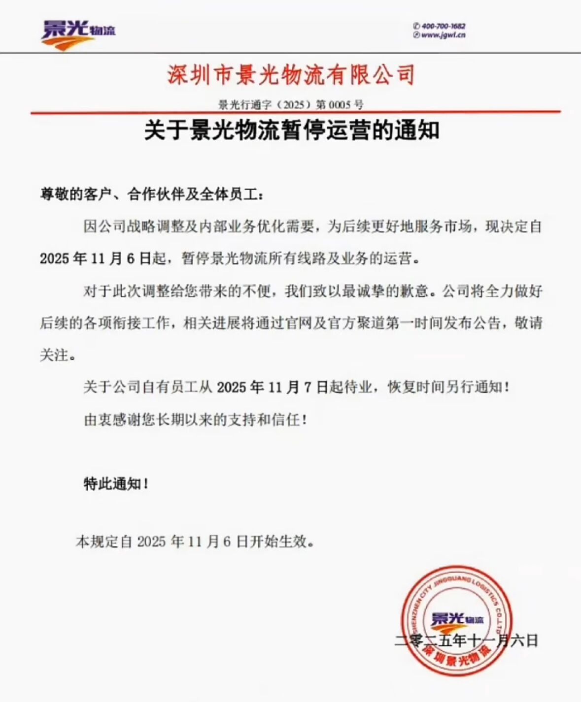 因公司战略调整及内部业务优化需要,为后续更好地服务市场,现决定自2025年11月6日起,暂停景光物流所有线路及业务的运营。对于此次调整给您带来的不便,我们致以最诚挚的歉意。公司将全力做好后续的各项衔接工作,相关进展将通过官网及官方聚道第一时间发布公告,敬请关注。关于公司自有员工从2025年11月7日起待业,恢复时间另行通知。通知落款为深圳市景光物流有限公司。