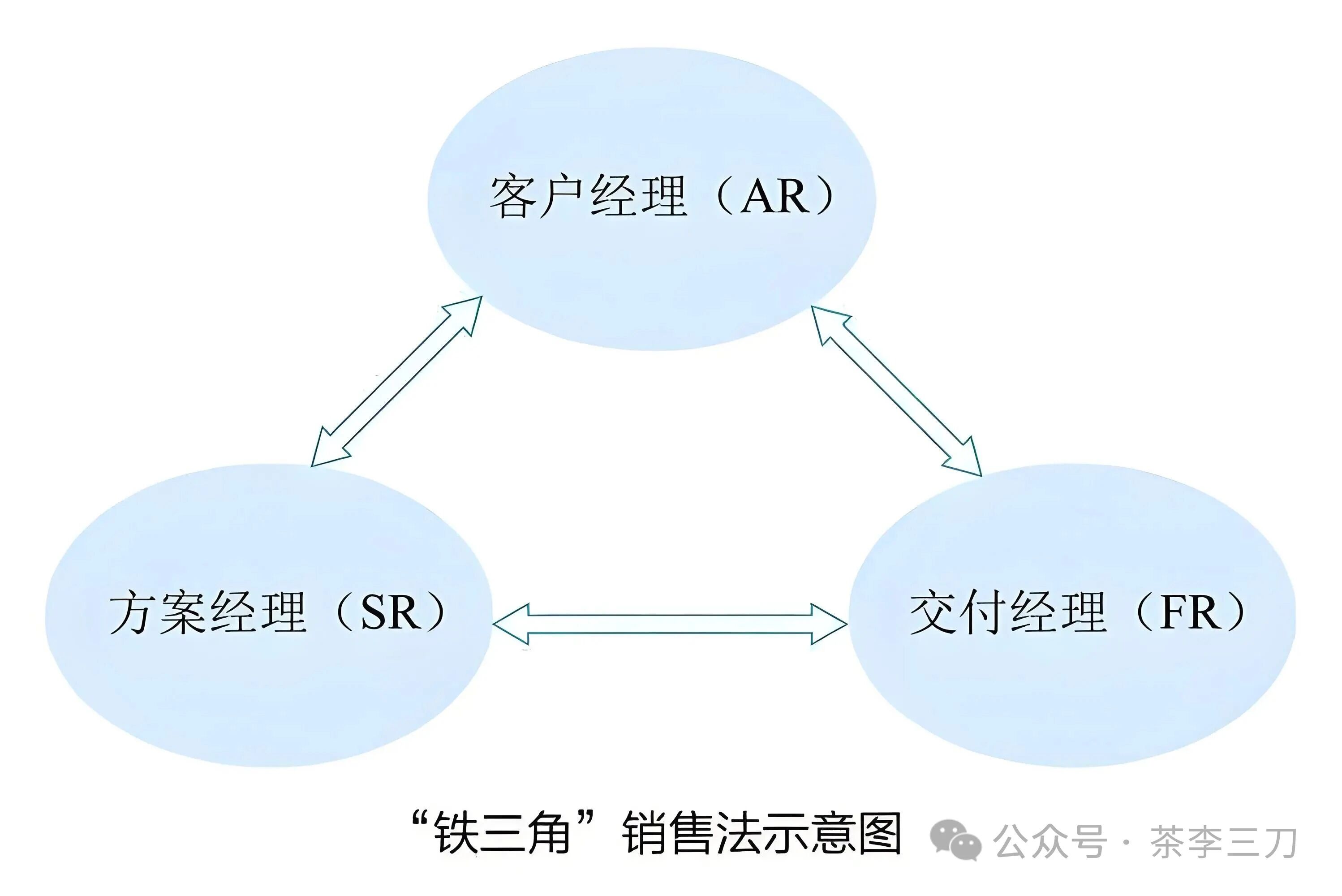 在传统的销售中,原本只有一个角色负责客户关系,就是销售员自己;而在铁三角销售体系中,是整个团队都在做客户关系,而且是从不同角度参与客户关系的建设:有人专门对口负责采购和商务部门,有人专门对口技术和测试部门,还有人负责的是运营部门和维护部门。