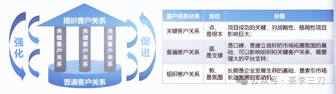 组织客户关系、关键客户关系和普遍客户关系,三者其实并不是递进的关系,而是共生的关系。就像一栋房子得有屋顶、有支柱、有地基。这三样东西都必须有,它们是有机的整体,只有做全做实这三样,才能让我们的客户关系如同房子一样稳固,才能更好地支撑公司的营销活动与业务发展。