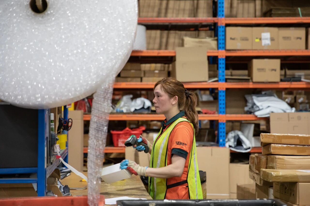 在中国邮政海外仓内,工作人员正在进行货物出仓作业。